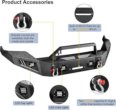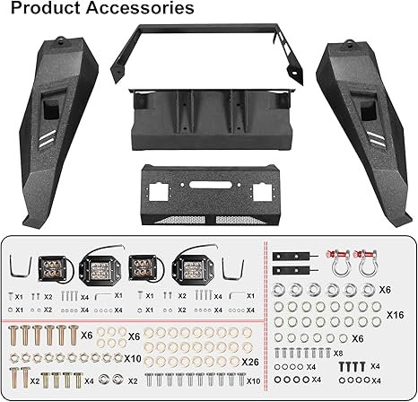 - What You Get: 1 x Front Bumper built-in Winch Plate (winch is not included), 1 x detachable bull bar, 2 x D-rings, 4 x 18w Square Lights, 1 set Screws, Washers Kit Mounting Hardware, 1 x Installation instruction.