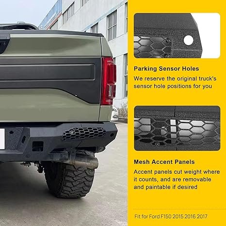 - Retain Sensor Holes: The custom rear bumper for F150 is designed with sensor holes, allowing for the integration of parking sensors for improved safety and convenience. Also features mesh accent panels for a lightweight design and is detachable for easy painting, offering both aesthetic appeal and practical functionality