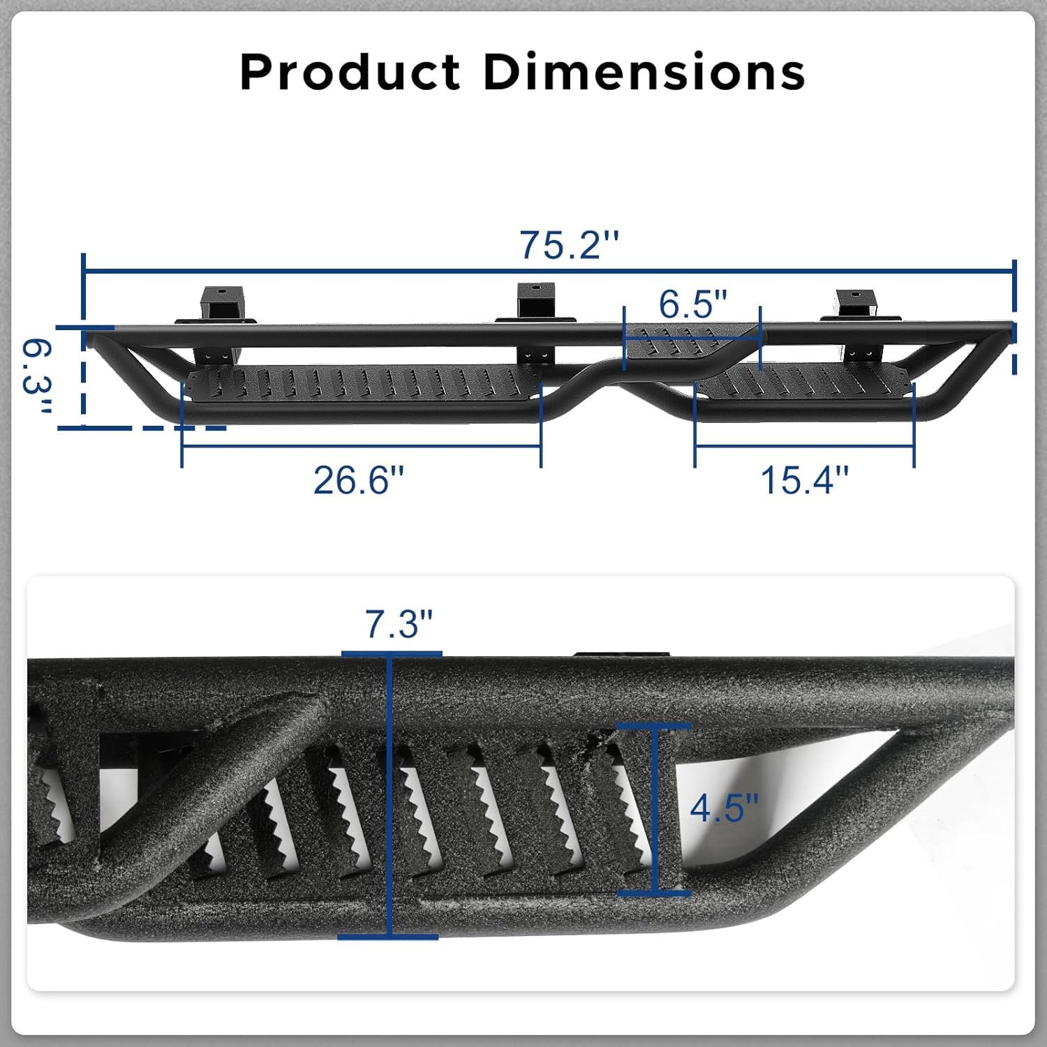 - DURABILITY AND STRENGTH- Reinforced heavy-duty carbon steel construction offers more than 550 LBS load capacity on each side and able to handle the weight of multiple passengers entering and exiting the vehicle as well as gear. Armored construction and lowered step surface shields lower body of vehicle from debris, impacts and damage when off-roading or in rough terrain
