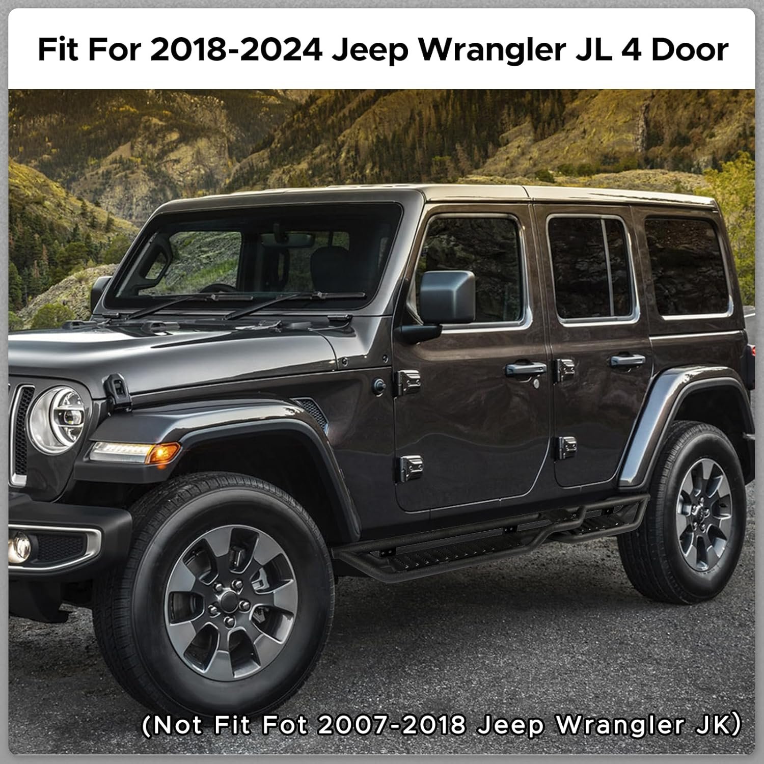 - FITMENT- The running boards are engineered for Jeep Wrangler JL 4 Doors Unlimited Rubicon/ Sport Utility/ Sahara/ Willys/ High Altitude/ High Tide/ 4xe models 2018-2024. Please confirm the Make, Model, Year and cab size of your vehicle before ordering