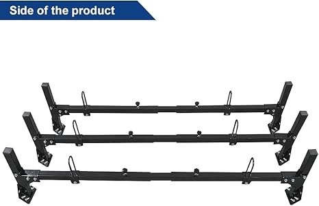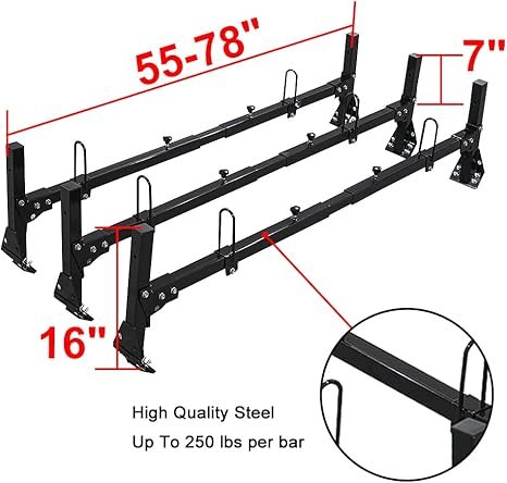 • Specifications; Color: black; Material: steel; Load capacity: 250 pounds per bar, 750 pounds in total; Mounting Place: van roof;